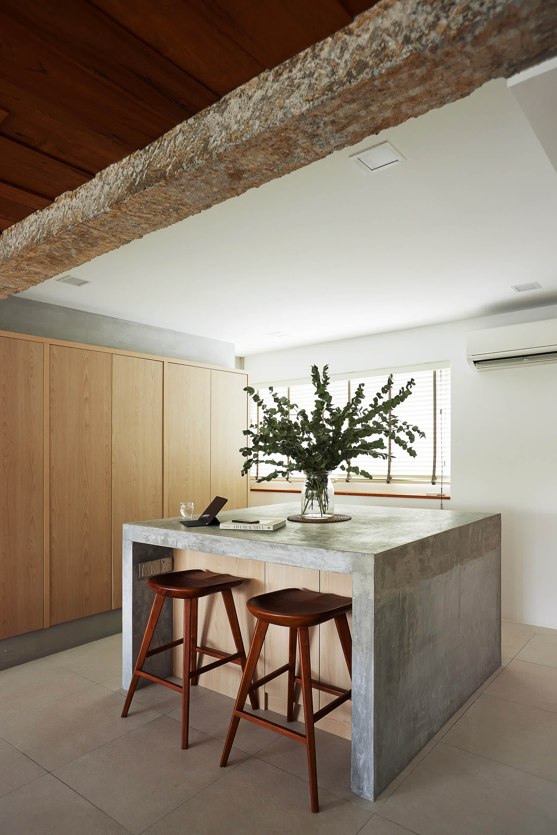 An eye-catching custom concrete island bar counter now stands in what used to be the dining room.