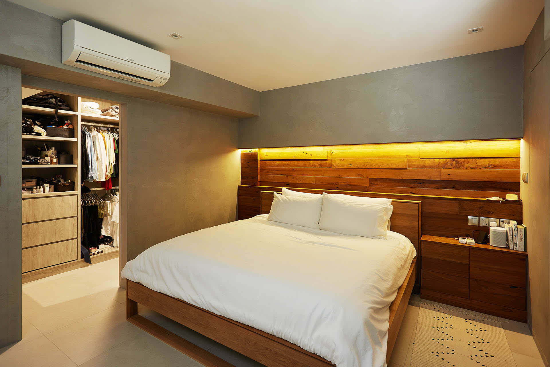 The wood and concrete-look design elements carry through to the master bedroom, which also has a roomy walk-in wardrobe.