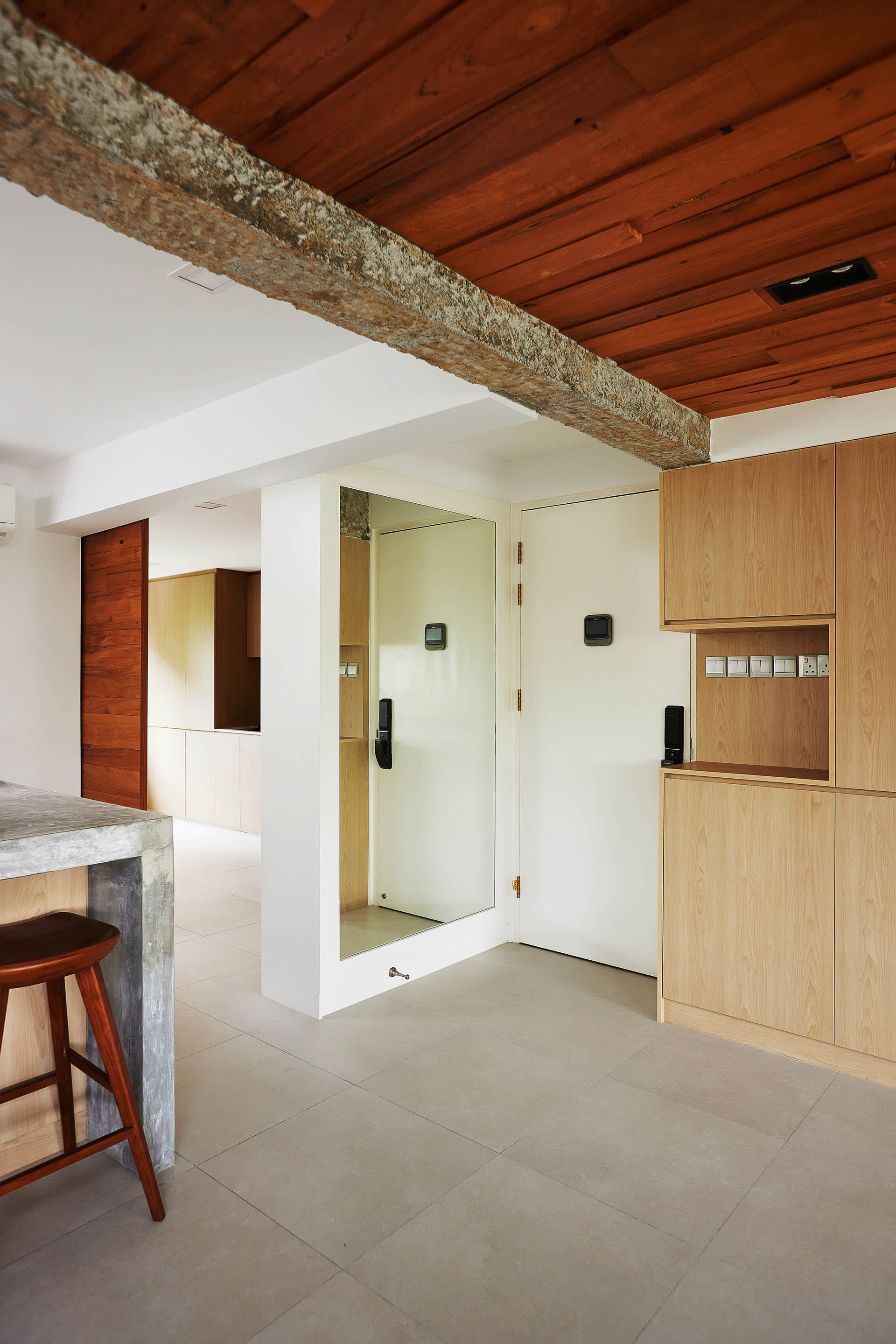 The first thing you'll notice as you enter the flat is the wood panelling on the ceiling that runs from the entrance and into the main area, subtly drawing you in to the space decked out in warm wood, complemented by raw textures like that on the exposed beams and neutral concrete tones.