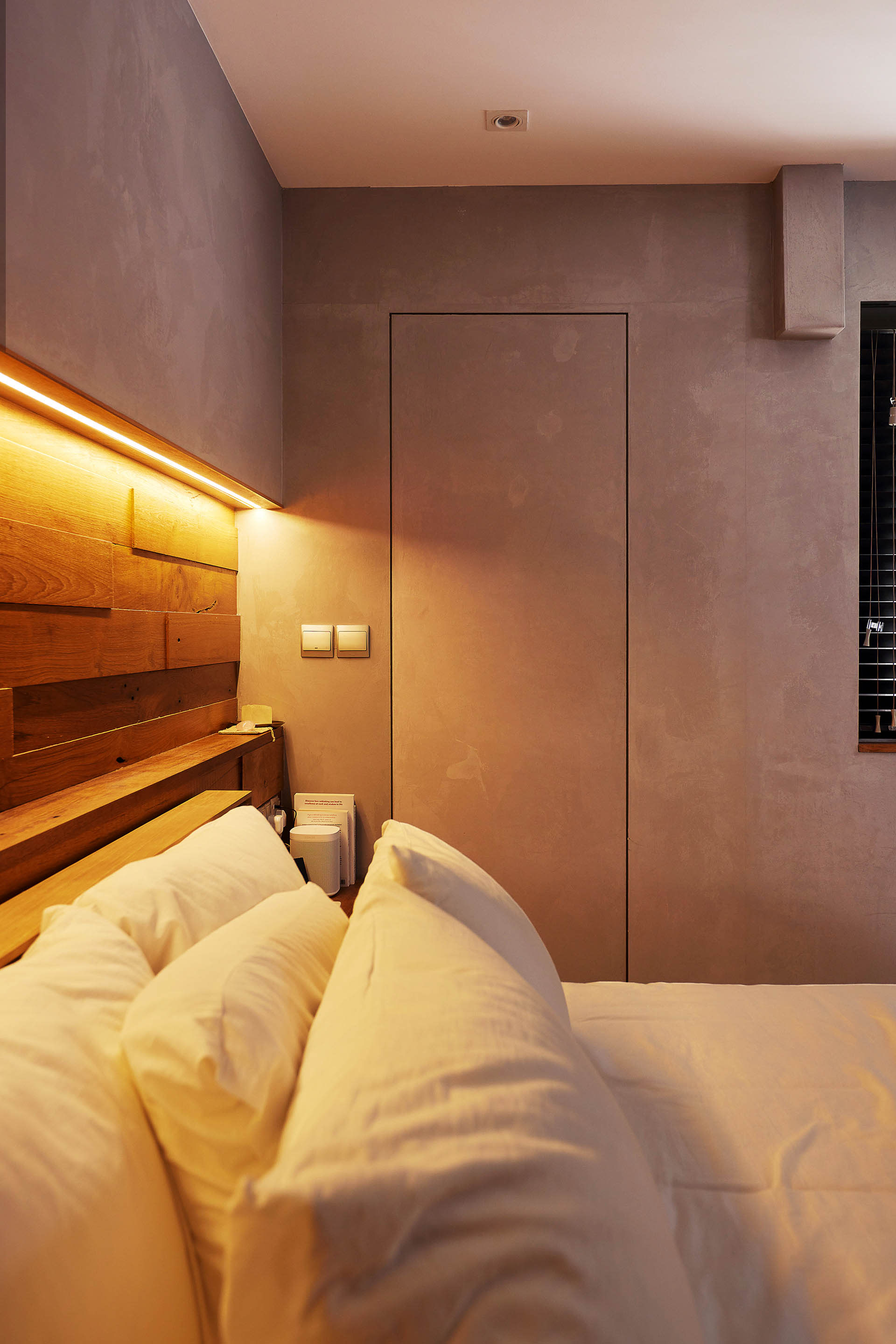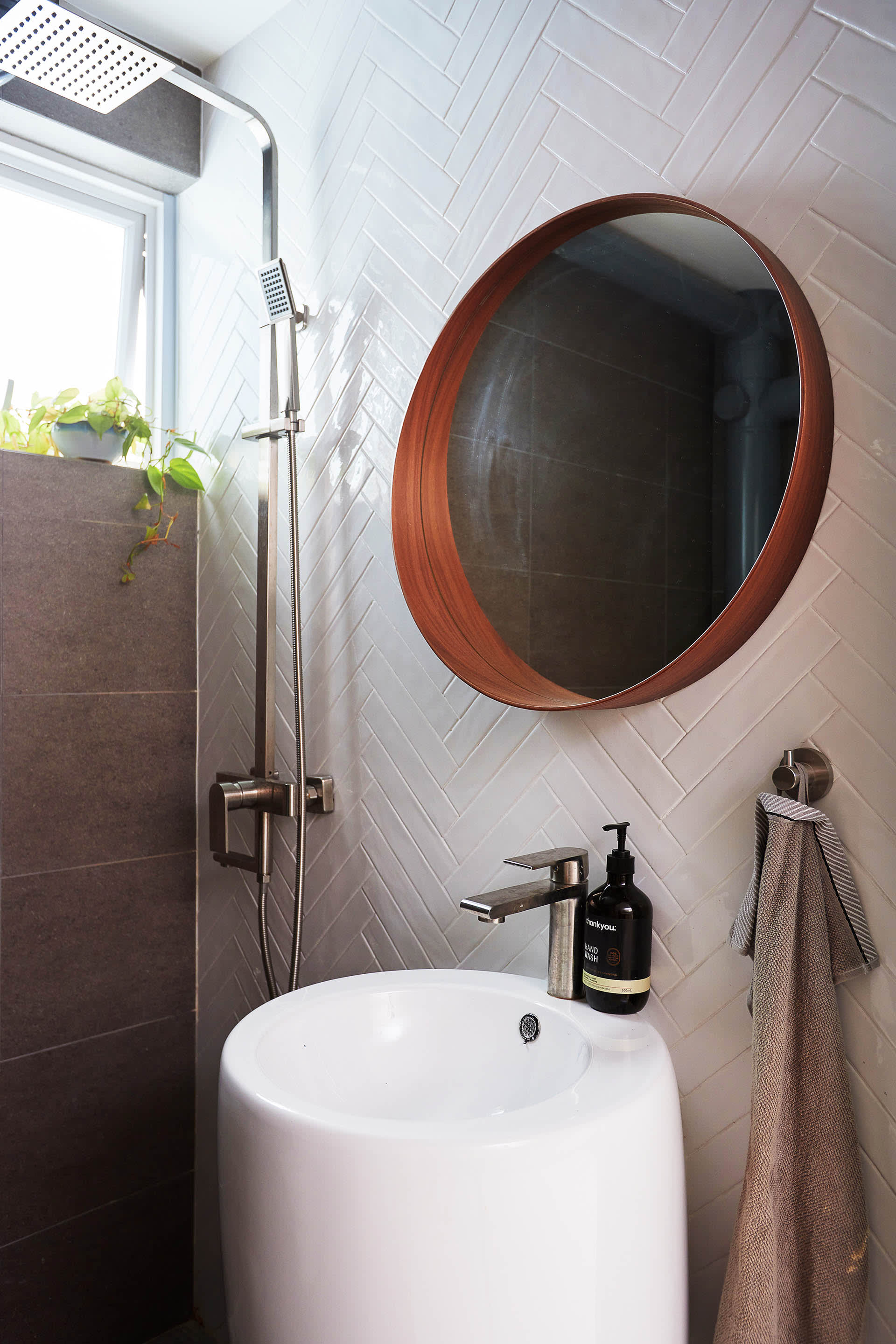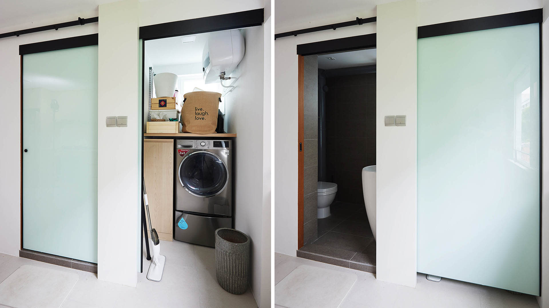 The home came with an unusually large common bathroom in the kitchen, which meant there was enough space for Fei to carve out a separate utilities room from it. The common bathroom and utilities room share a sliding door, a quirky and space-saving feature.