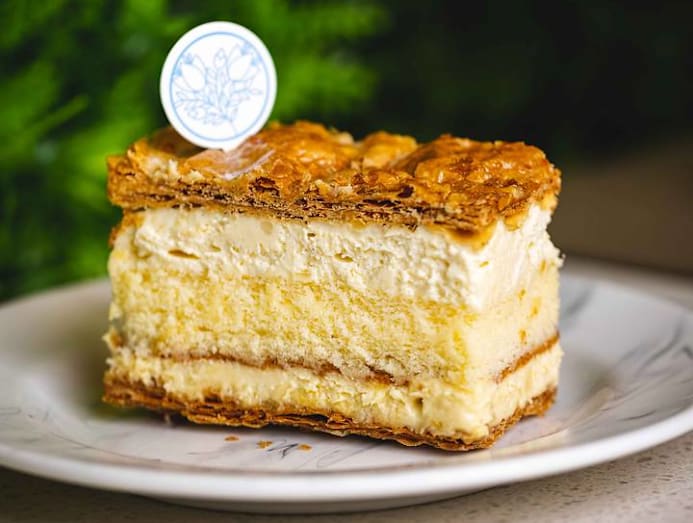 This features a slab of durian mousse wedged between two wafers of buttery, slightly savoury flaky pastry. A mess to eat (don’t order on a date), but so delish — you get the light, creamy mouthfeel of the blended puree and the crunch of pastry with every bite.