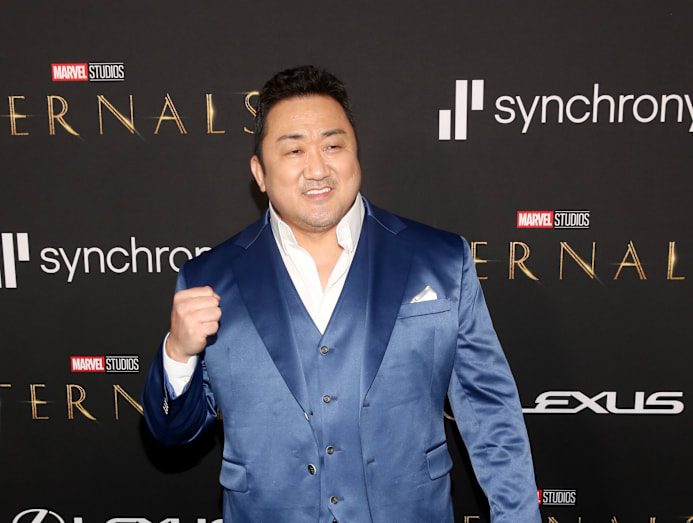 Dressed in a shiny blue suit, the Train to Busan star, aka Ma Dong-Seok to his Asian fans, makes his Hollywood debut as Gilgamesh, the strongest among the Eternals. His character is very close to Angelina’s Thena and protective of her.