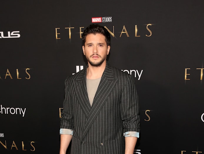Another Game of Thrones alum. Kit, who plays Dane Whiteman, Sersi’s love interest, went for a casual look with the pinstriped suit.