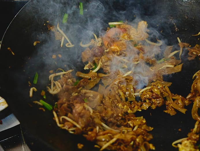 Penang char kway teow, like the local version, has just a few main ingredients. Flat rice noodles, lup cheong (Chinese sausage), chives, beansprouts, cockles and lard. Song Maw fries the ingredients at a “maximum of three plates at a time. If not, it won’t have the wok hei,” he explains simply.
