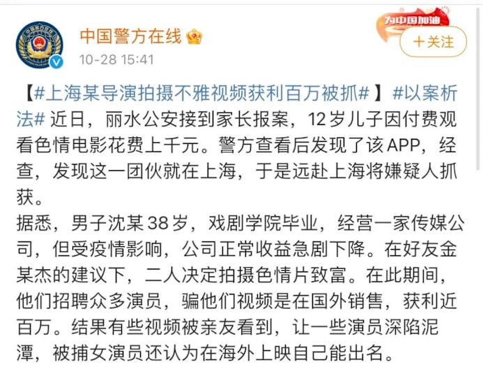 Last week, Chinese police shared on Weibo that a 38-year-old Shanghai director, surnamed Shen, was arrested along with two women who had previously starred in his films.
