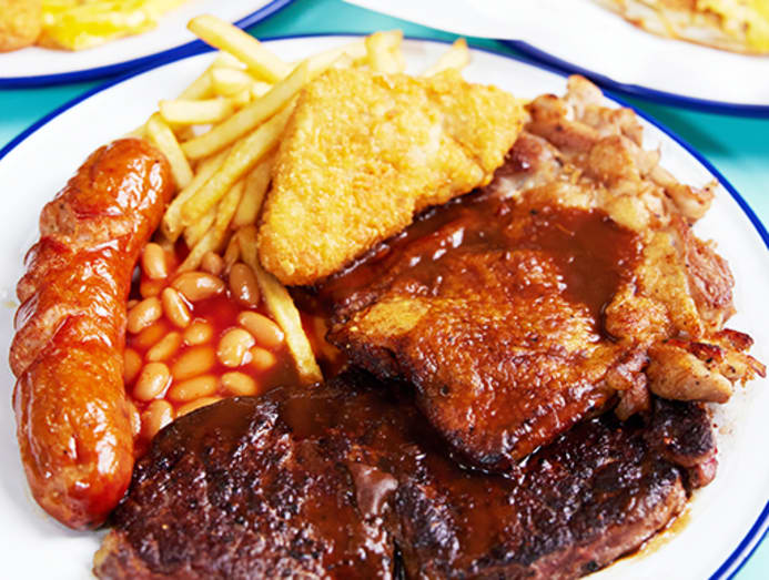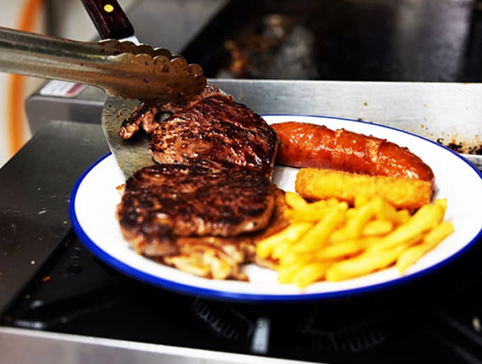 Burgrill’s marbled beef striploin steak, draped with a house-made brown sauce, is reasonably succulent with a good sear. It comes with generous, homely sides of crispy shoestring fries, hashbrown and baked beans. We had this in a takeaway paper box before the dine-in ban was lifted, so we foresee diners having some difficulty cutting steak on an enamel plate. A sturdier plate would be nice.