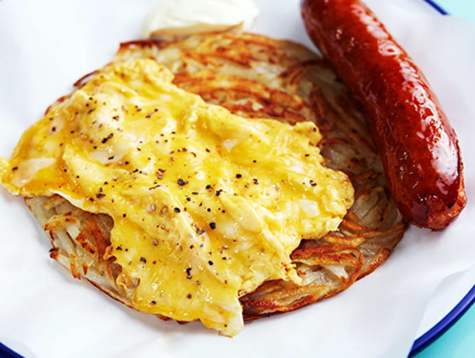 This value-for-money set gets you a big frying pan-sized Swiss rosti, sour cream, scrambled eggs and a 100g chicken bratwurst. For comparison, Marché's popular plain rosti of a similar size costs around $9 before GST.
