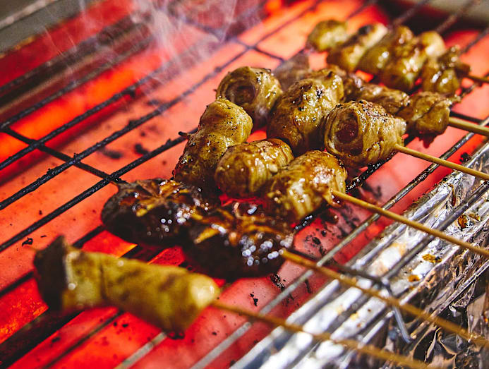Yakitori, which translates to grilled chicken in Japanese, often refers to grilled meat-on-a-stick sprinkled simply with salt or glazed in salty-sweet sauce. This hawker version is set up by three pals from Sarawak, Malaysia. Lim Sii Xu (far left) and Lai Yiew Jian (extreme right) have been cooking since they relocated to Singapore in 2008. They man the stall daily, while Stephen (middle) helps with backend work. Expect meat and veggie skewers cooked over a gas-powered grill to order, as well as heartier sharing plates.