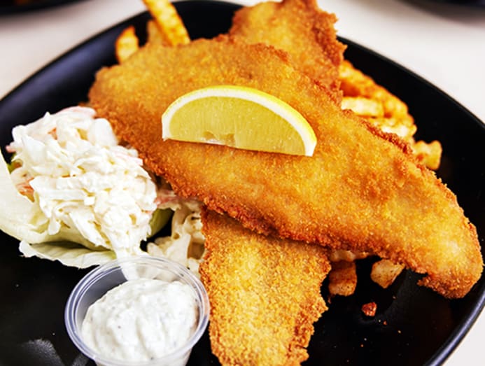 Slabs of basa fish are coated in panko crumbs and deep-fried till crispy in vegetable oil. The Vietnamese catfish has a soft, buttery texture similar to cod, though we find our slabs a little too thin for good bite. The fish & chips come with (pretty good) Cajun fries and coleslaw by default, though you could also swap ’em for regular sides like butter rice, white rice, baked beans or a salad.