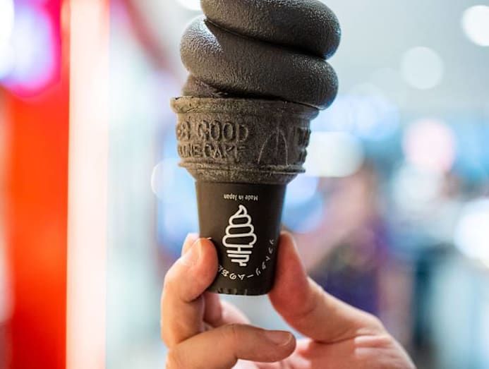 This was the first cone we put to the test. Fresh from the churner, we flipped it upside down and started the timer. Unfortunately, it didn’t come anywhere near the mark. It starts ‘sweating’ mere seconds after being turned upside down, and the entire swirl of soft serve plops unceremoniously out of its cone and onto the floor. Apparently, the charcoal powder agent makes it less firm. We were told the original flavour would fare better (see below).