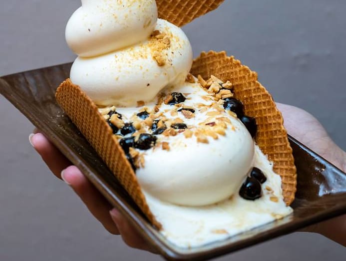 The soft, chewy Okinawa brown sugar boba are actually locally sourced generic tapioca pearls. The only difference is they are cooked with Okinawa brown sugar, which gives them a deeper and earthy flavour that's characteristic of the Japanese sugar. They impart a fragrant, smoky aroma and add another dimension to the dessert. Moreover, the crispy elements in this dessert lend a good complementary texture. While the dessert looks pretty in its curved shell, it’s not meant to be lifted up and eaten like a taco (it's too big and messy) — it’s served in a paper tray and meant to be eaten with a spoon. Not bad.