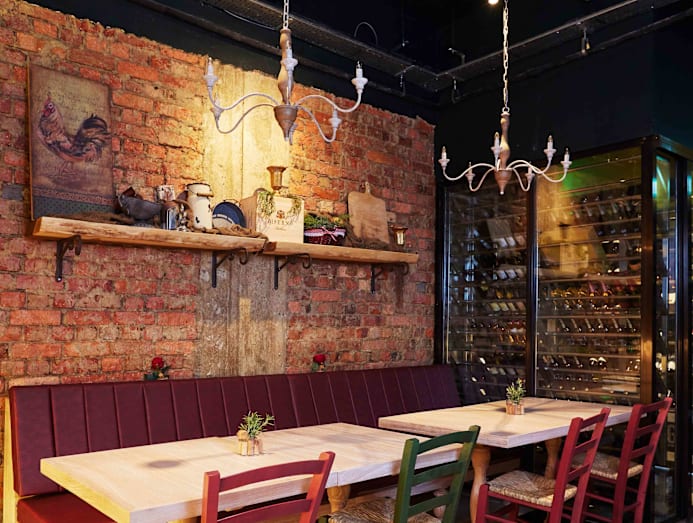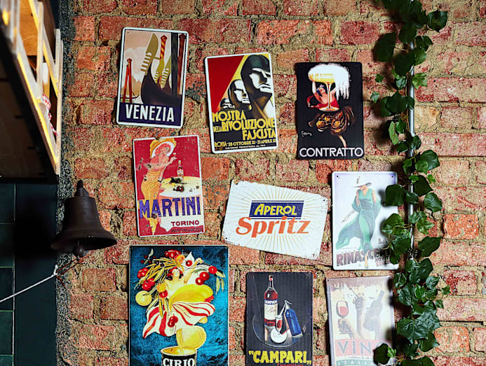 Knick-knacks like retro Italian posters on the brick walls create a homely, welcoming vibe.