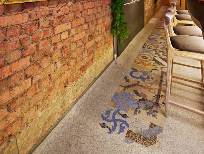 The piazzetta (small square) tiles in the al fresco area were specifically designed to evoke Italian piazzas (town squares or marketplaces).
