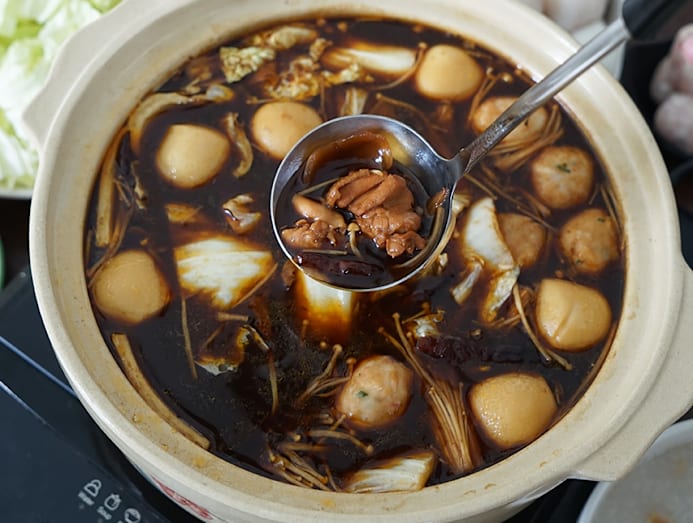 The hotpot set comes with a spicy chicken soup base made with ingredients like garlic, herbs, dried chillies, chicken broth (1kg), and chicken chunks (300g), as well as a small pack of dried chillies and peppercorn for those who wish to dial up the heat.