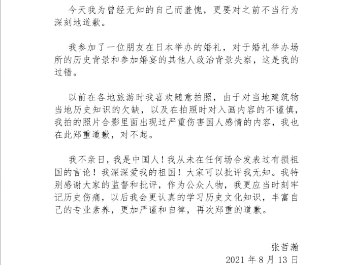 As for his visit to the Yasukuni Shrine, Zhehan wrote, “Due to my lack of knowledge regarding the local buildings and history, as well as my carelessness, the photos I took showed content that seriously hurt the feelings of the Chinese people. I solemnly apologise, I’m sorry.”