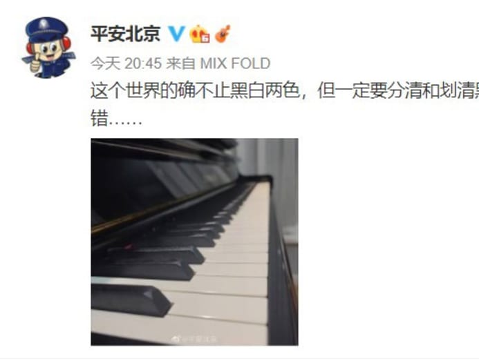 Although their identities were not revealed, Beijing police later posted a photo of a piano on Weibo, with the caption: The world is more than black and white, but one must distinguish between black and white. Make no mistake.