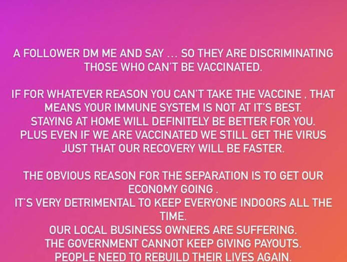 As it turns out, one of her followers had sent her a direct message, sharing that they felt that this new announcement from the government was “discriminating [against] those who can’t be vaccinated”.