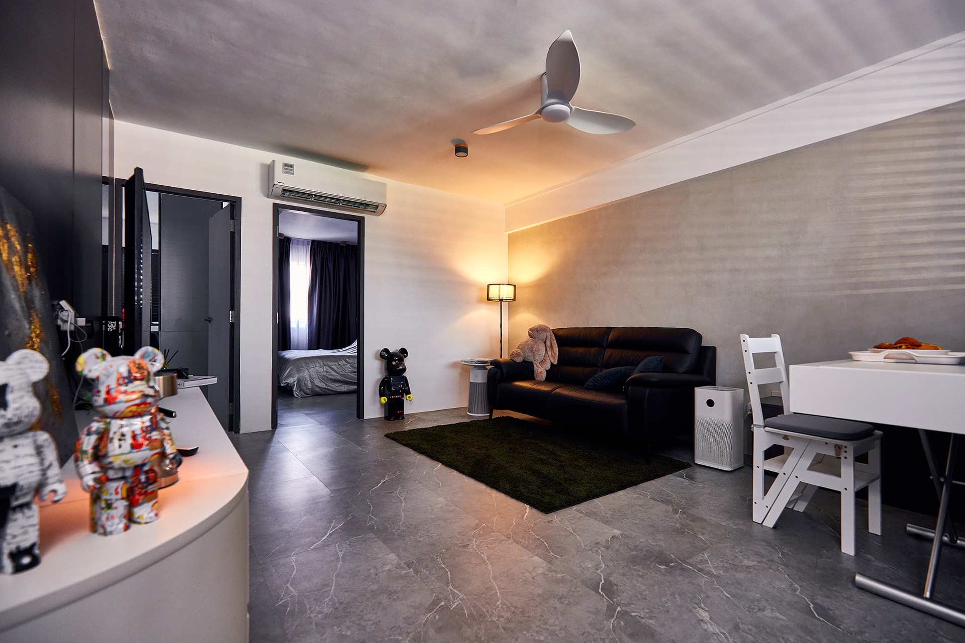 Desmond, who admits to being “chin chye”, left most of the design suggestions to his ID. “The only thing I really wanted was to be greeted with a square, spacious living room when I open the main door,” he says.To achieve that, the awkward storeroom at the corner of the living room was hacked and the space is kept minimal with furnishings in muted tones.