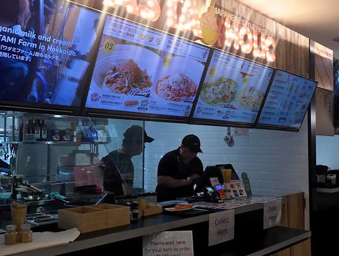 This stall sells just two dishes: Ma-ze Soba ($12), which is really dry ramen topped with minced pork, beef, veggies and a raw egg yolk, plus a Cream Cheese Mochiri Tofu dessert ($8) comprising Japanese mochi pudding drizzled with a caramelised black sugar sauce. Talk about specialisation.