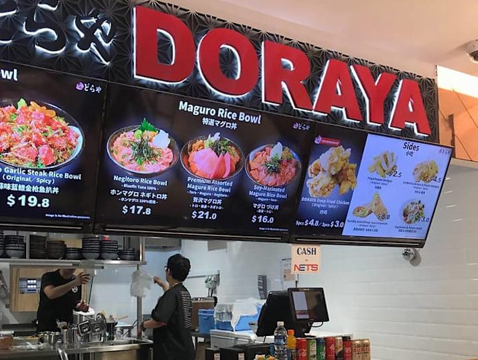 Head here if you’re craving for tuna donburis. The stall serves maguro (bluefin tuna) bowls loaded with either cooked tuna steaks or raw tuna, such as the Toro Steak Rice Bowl ($19) with fatty tuna belly slices, and Premium Assorted Maguro Rice Bowl ($21) with toro (fatty tuna belly) and negitoro (minced tuna). There are also sides like Doraya Deep Fried Chicken ($4.80 for five pieces) and a Tuna Tortilla Salad Wrap ($8.80).