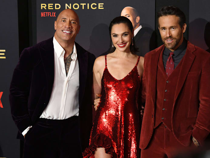 Three's a company: Dwayne Johnson, Gal Gadot and Ryan Reynolds at the Netflix's 'Red Notice' World Premiere at LA Live in Los Angeles on (Wednesday) Nov 3, 2021.