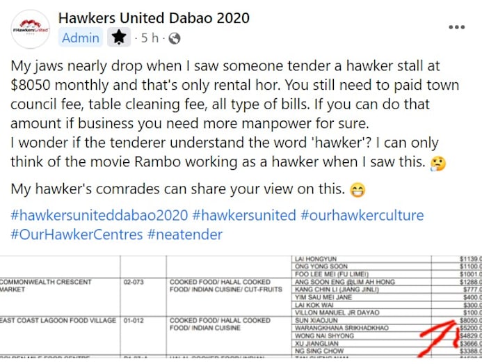 The list was also highlighted by hawker Melvin Chew, who runs Chinatown stall Jin Ji Teochew Braised Duck & Kway Chap, on his Facebook hawker food group Hawkers United. In his post, he wrote that his “jaw nearly dropped” when he saw the bid, pointing out: “That’s only rental hor. You still need to pay town council fee, table-cleaning fee, all [kinds] of bills… I wonder if the tenderer understood the word ‘hawker’?”