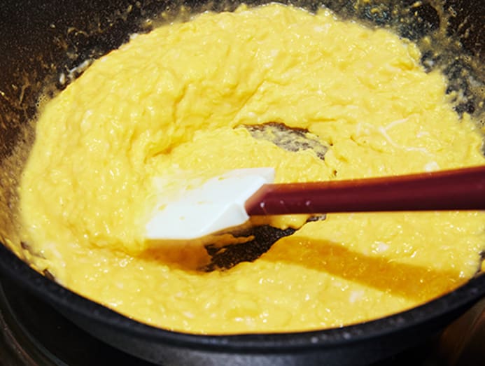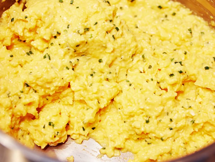 A lot of patience and hard work goes into cooking the soft scrambled eggs, seasoned simply with salt and chopped chives. The raw eggs (no particular provenance preferred, we’re told) are poured into a skillet with chunks of butter (no milk used), and cooked over low heat by a staff member who continually stirs the mix and lifts it off the stove intermittently to prevent the eggs from overcooking.