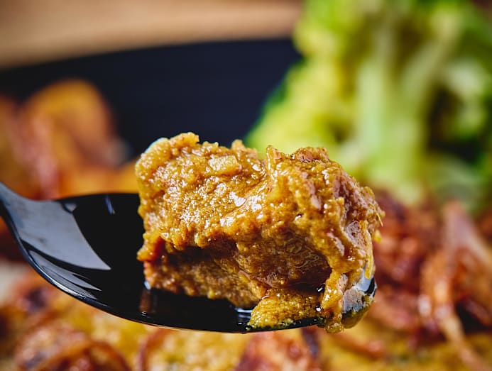A similar curry base here is thickened with yogurt, adding a touch of creaminess to the fork-tender chicken chunks. However, we find the notes of cardamom a tad overwhelming.