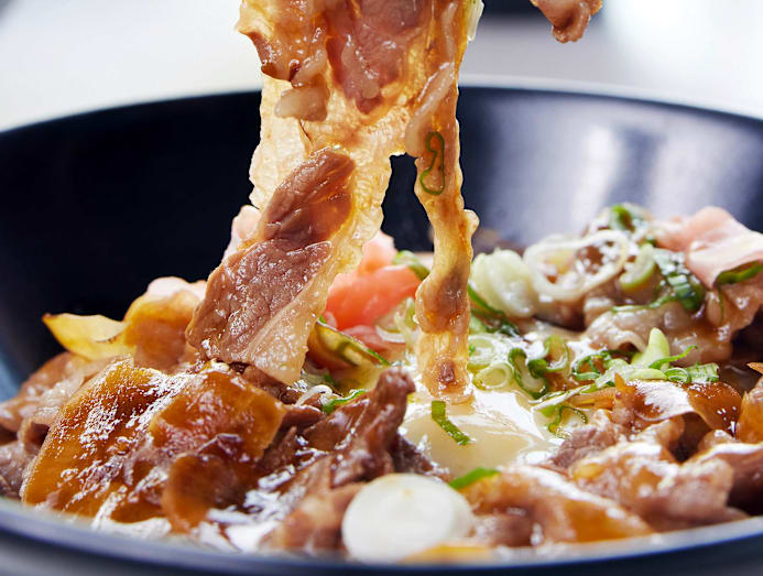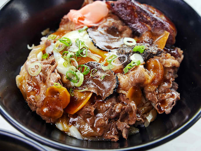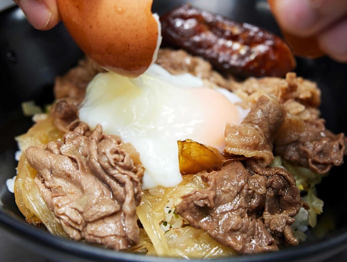 Cheaper secondary cuts of frozen Australian wagyu in the beef bowls keeps prices low. They comprise two types of cuts – which he won’t reveal – for different textures and marbling, sliced against the grain for tenderness on a hefty silver $6,000 machine sitting silently behind the counter.
