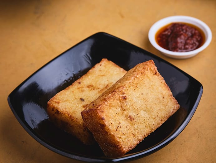 Grated white radish is mixed into rice flour with dried shrimp and steamed before being deep-fried first, then pan-fried once more to order. It’s creamy and unctuous on the inside with a nicely crisp outside, but a bit too oily for our liking.