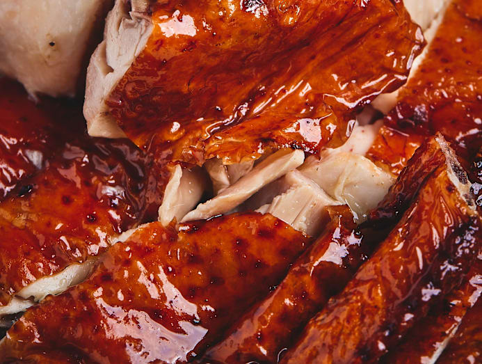 The duck’s skin is scalded with boiling water before getting a secondary shower in a honey mix, then left to hang overnight to dry before being roasted the next morning.