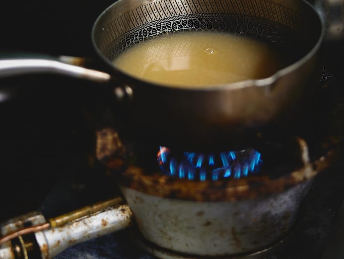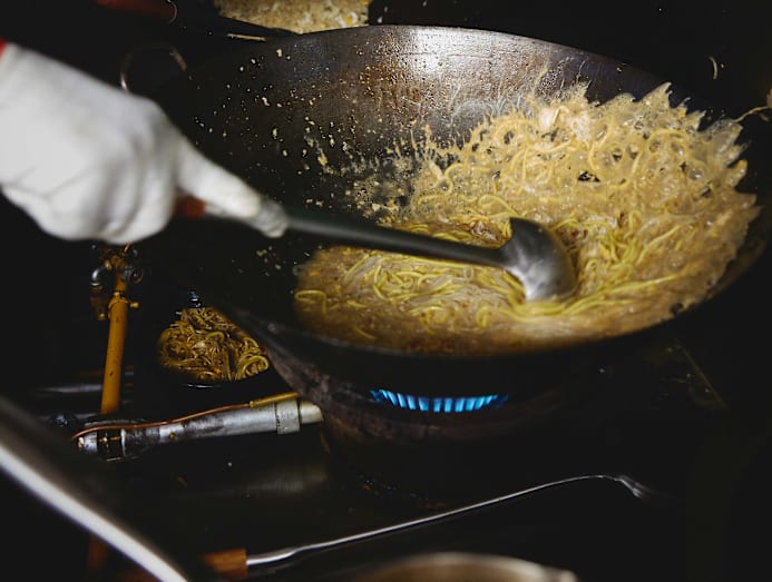 Both dishes are made with different stock bases: the pao fan with pork bones, boiled “for at least 12 hours, to extract the gelatin”, along with a prawn-head and clam broth for the noodles that’s simmered for a shorter two-and-a-half hours.