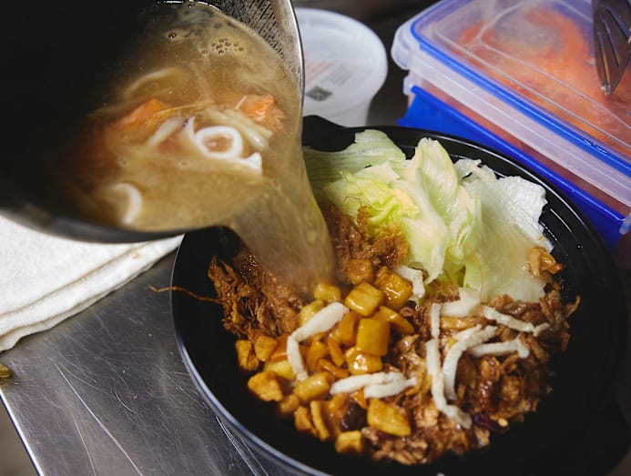 Johnson whips up Hokkien mee and fried rice in two separate woks. Meanwhile, his wife arranges the components for the pao fan in a bowl for him to ladle boiling hot prawn-and-pork broth into.