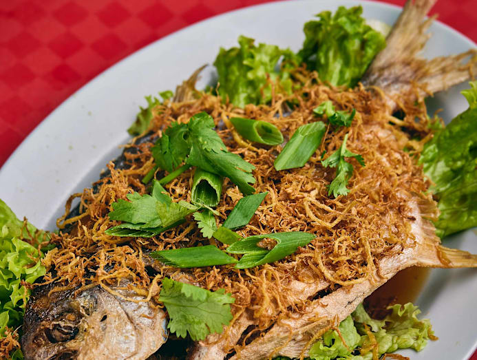 There are four soupy offerings from $4.50 and go up to $12. Each comes with little cubes of tofu, tomato and tang oh veg. There’s sliced batang fish soup, deep-fried batang fish head soup and mixed seafood soup, along with a fancy blue cod version (that latter printed on a separate menu stand). For sides, there’s ngoh hiang (from $3) and deep-fried golden pomfret - the traditional Teochew offering of pomfret fish soup isn’t included here as the chef says its shelf life is too short (it has to be screamingly fresh in soups or when steamed — the fried version is a bit more forgiving). Your choice of carbs like rice or mee sua will cost an extra 50 cents.