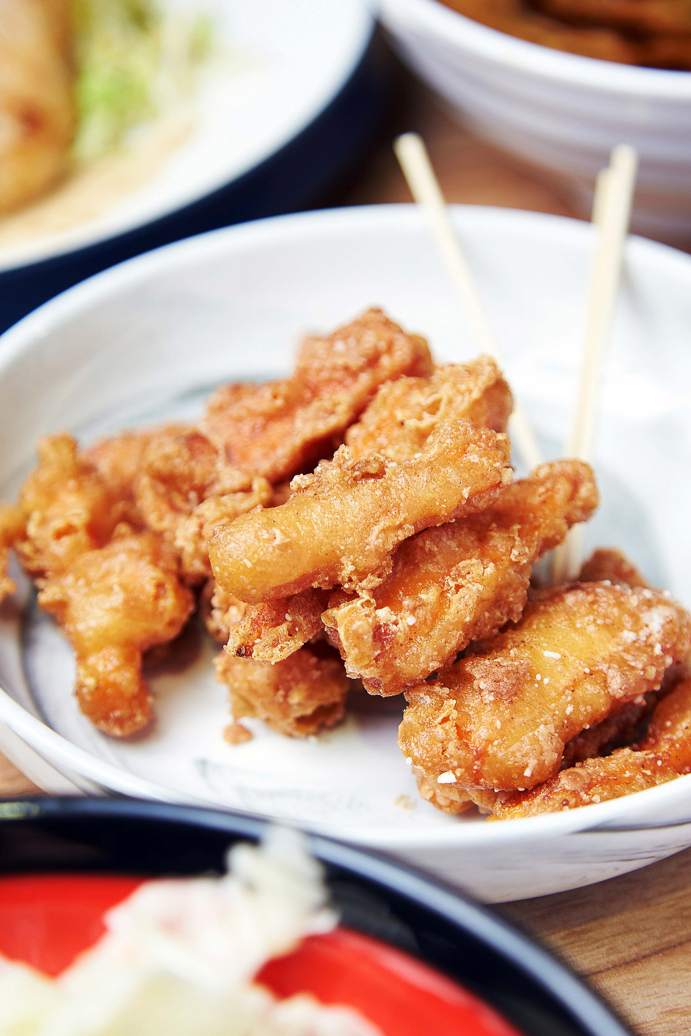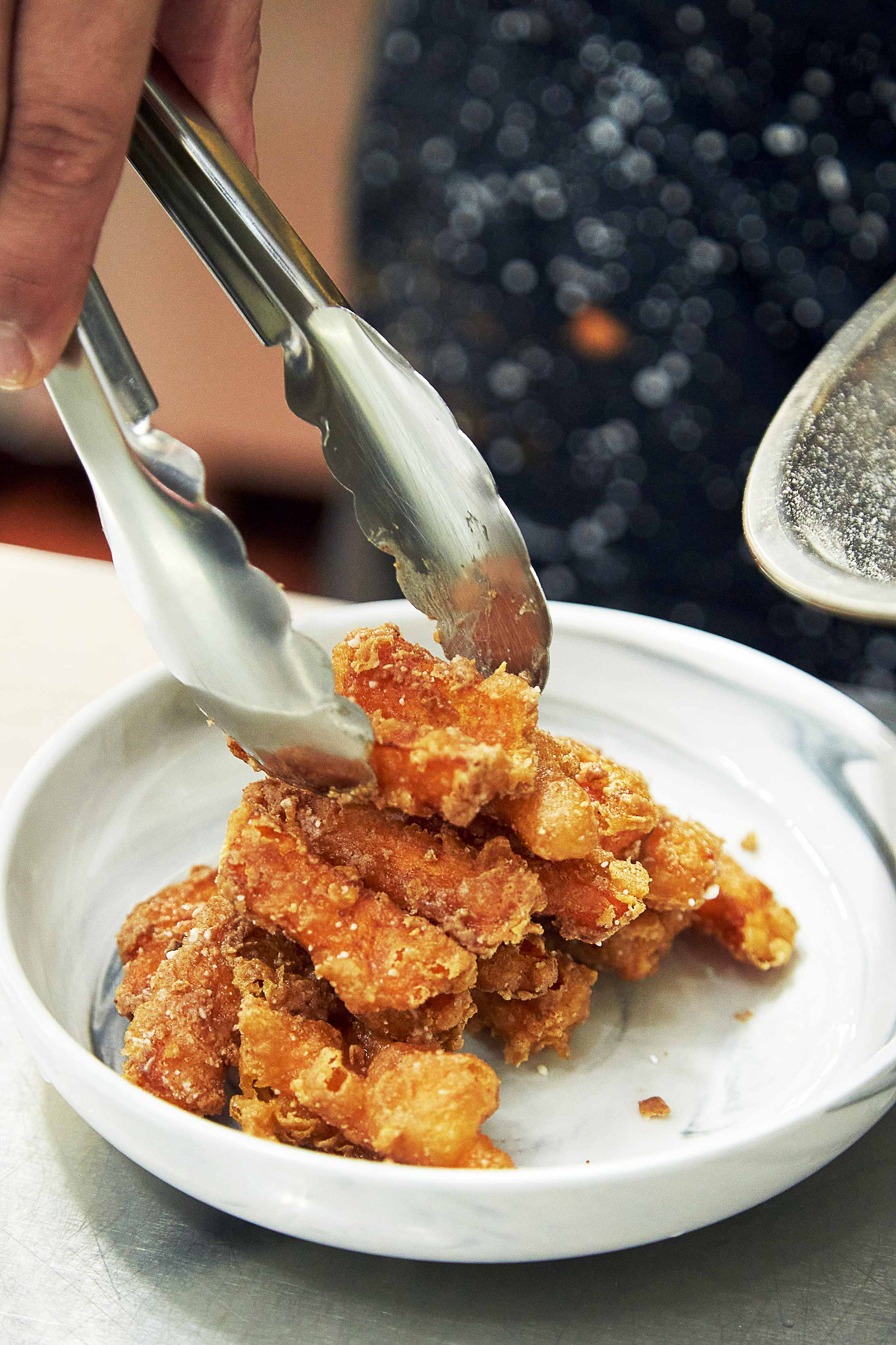 Thinnish wedges of sweet potato are battered in a mix of five flours (Johnson won’t say what) and par-fried. They’re finished upon order and covered with plum powder, salt (and probably a fair portion of MSG). The batter forms a ridiculously crispy coat that shatters when we bite into it. Worth every calorie.