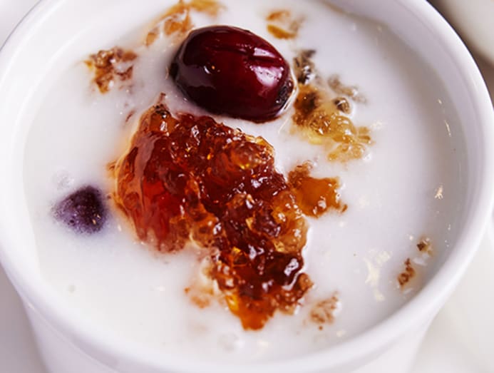 Peach gum, popular for its collagen content with supposedly beautifying properties, is liberally added to a few desserts here. Like this comforting milk option, which is served warm and laden with plump red dates and peach gum cooked down to a gelatinous jelly-like consistency.