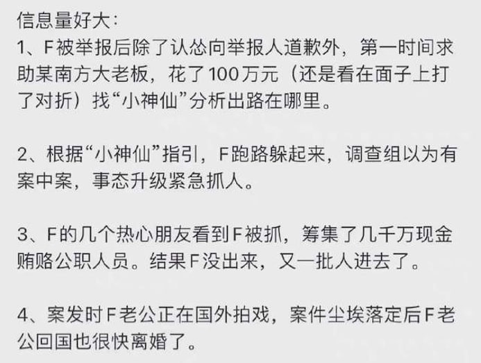 This person told F to hide, but the actress ended up getting caught instead. F’s friends started pooling “tens of millions” to try to buy off those in the government to get her out of trouble, but ended up in hot soup themselves.