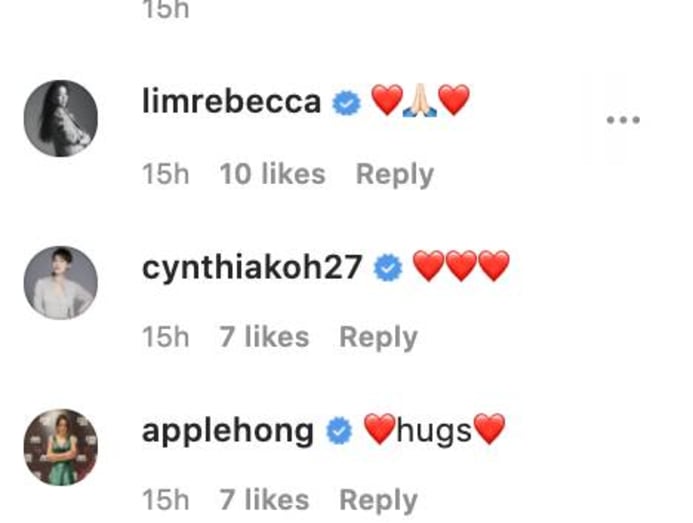Celebs who’ve left comments include Fann’s husband, Christopher Lee, as well as Rebecca Lim, Chen Hanwei, Hong Huifang, Jeanette Aw and Lin Meijiao.