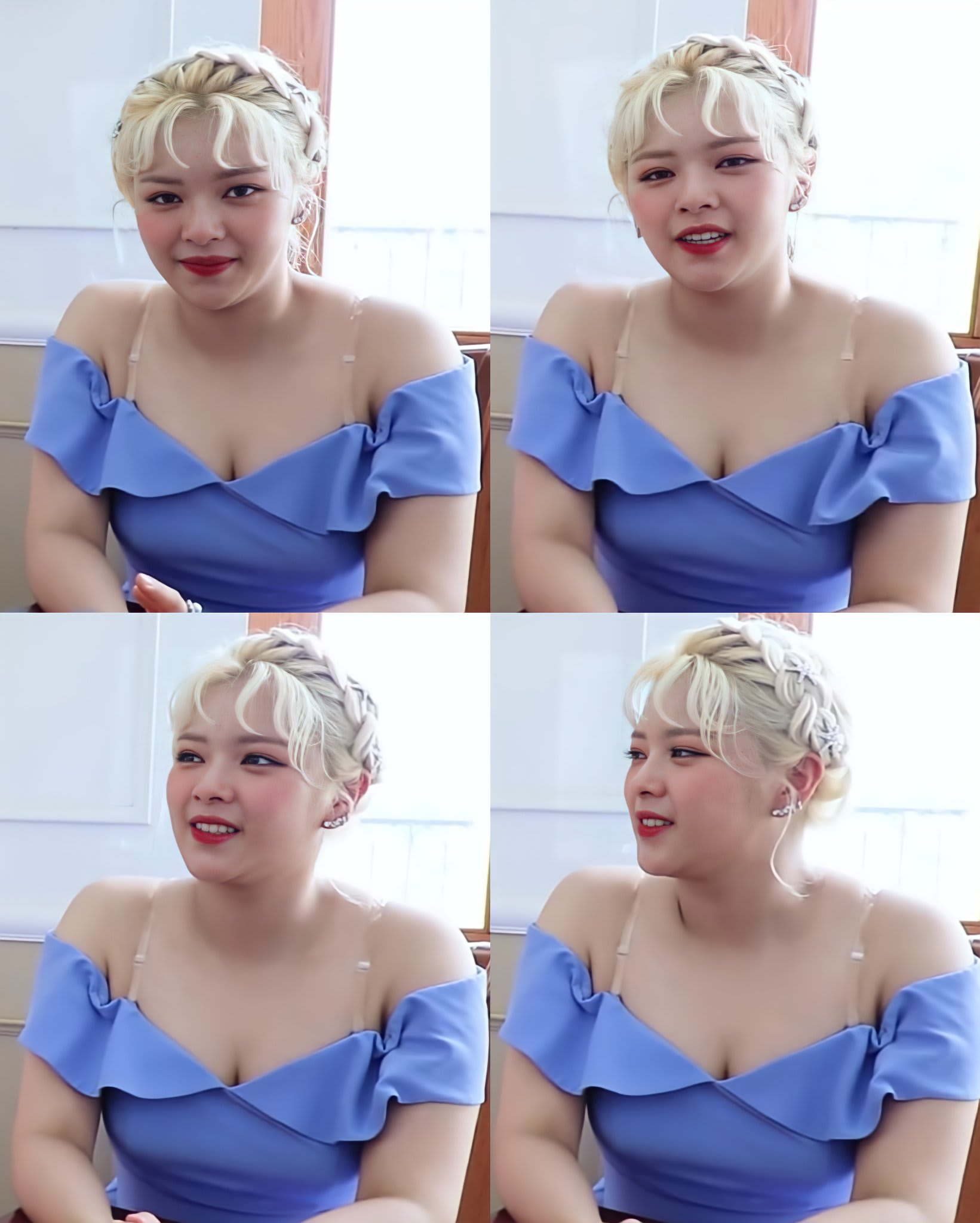 In the pictures, Jeongyeon appears to have put on some weight but is also looking as radiant as ever in platinum blonde hair, rosy make-up, and a blue off-shoulder dress.