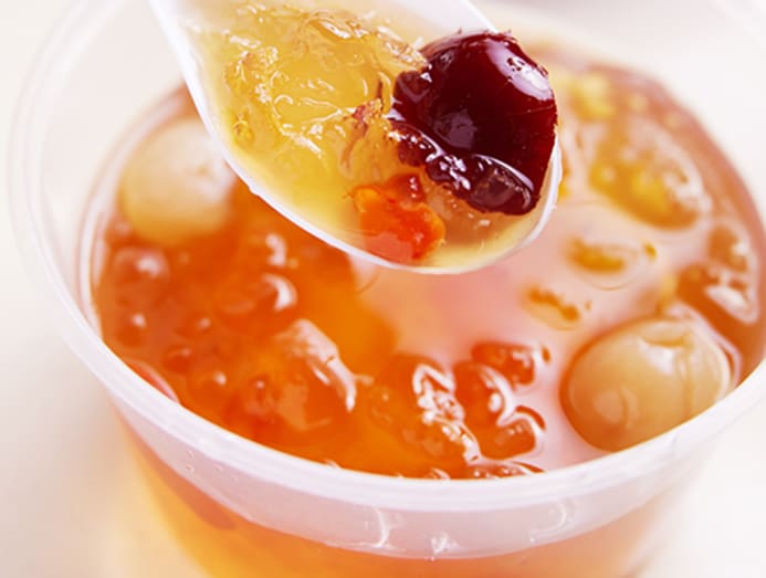 Amos’ snacks are offered from 8am till sold out (usually around noon). There are five types of fried fritters here, plus a refreshing Peach Collagen dessert: