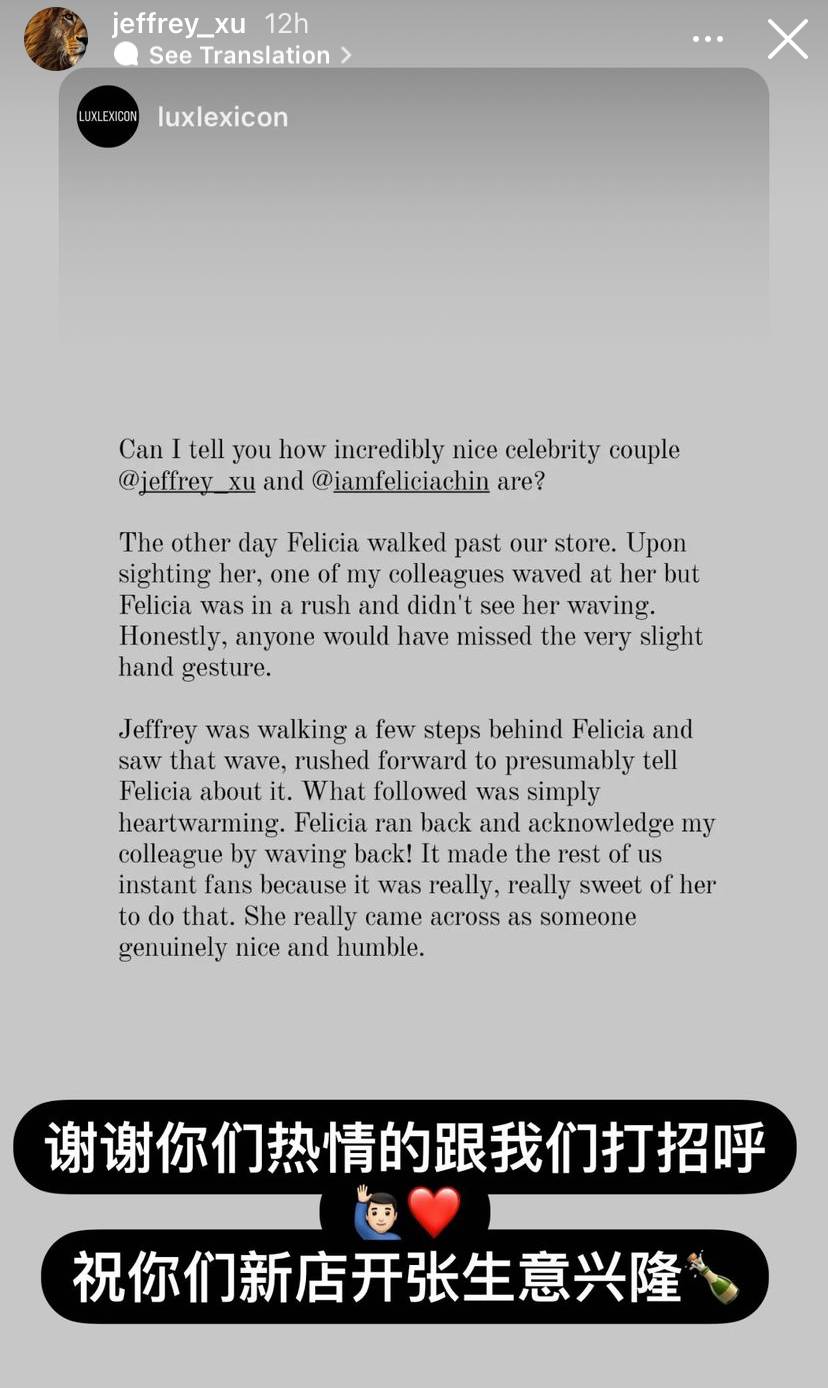 According to the netizen, Feli and Jeffrey happened to pass by their store one day. One of the staff, who is a fan of Felicia, raised her hand to wave at the actress.
