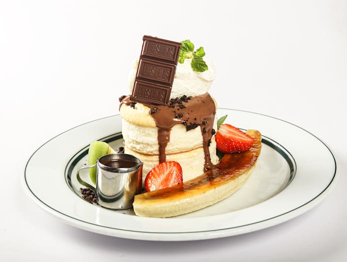Signature soufflé pancakes drizzled with Hershey’s chocolate sauce, and topped with whipped cream, strawberries and half a caramelised banana.