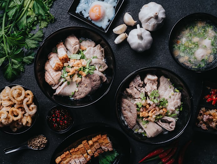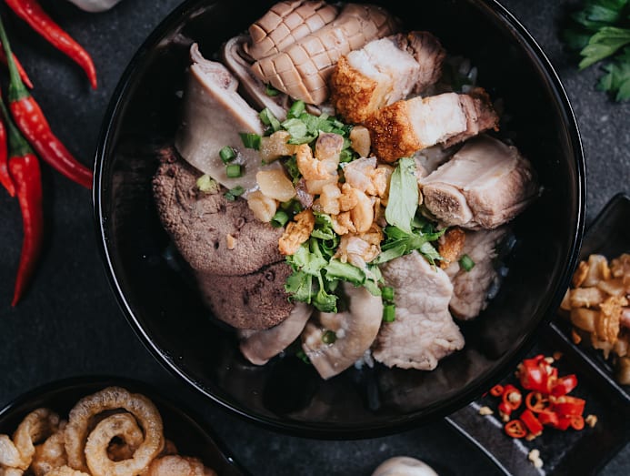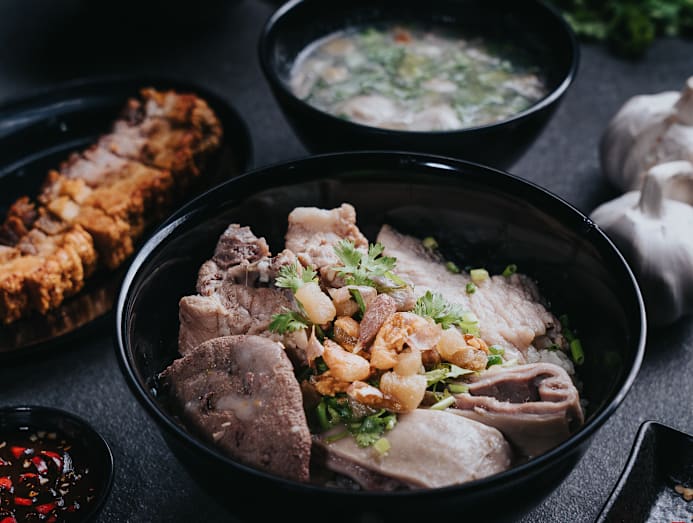 Thai Jasmine rice is cooked in a broth – containing pork bones, a mix of white and black pepper, and other “secret” spices – that’s been simmered for four hours, and topped off with lard and whole Thai garlic cloves, both deep-fried. A thinned version of the broth is served alongside the bowl, and toppings include pork rib, handmade meatballs (shaped from marinated minced pork), lean meat, liver and stomach.