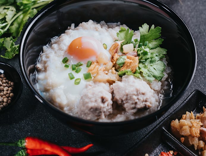 A dish that Sandy used to make for her husband and son at home crafted from Jasmine rice and pork-bone broth, with added heft by way of an egg, minced meat and handmade meatballs.