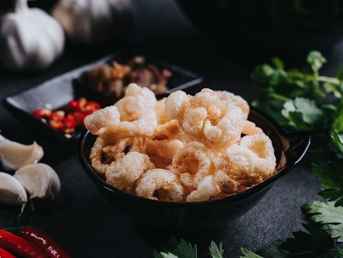 Supplier-bought crunchy pork skin if you want extra crunch with your dry rice porridge.