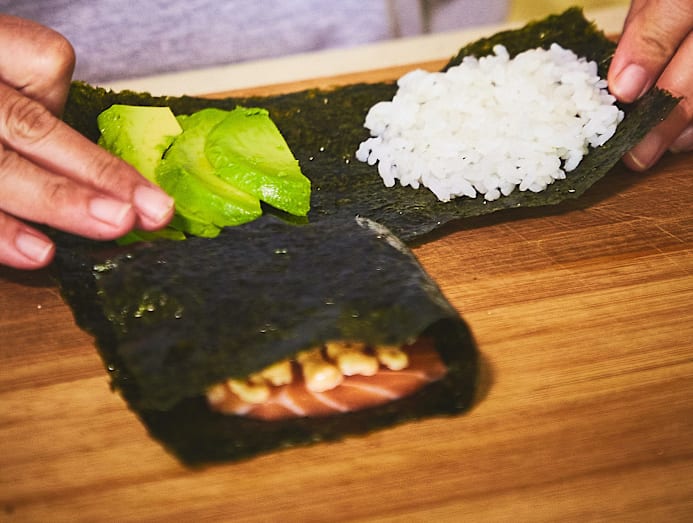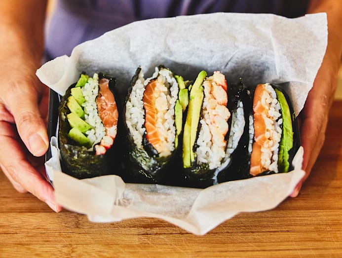 Just about everyone loves sushi. But not everyone is adept at rolling sushi. A too-loose roll flops about flaccidly, making it difficult to cut through and, eventually, a mess. Thanks to the viral folded kimbap trend (kimbap being the Korean answer to Japanese sushi rolls), we decided to put together a tutorial for these folded sushi filled with the crowd-pleasing combination of aburi (partially torched) salmon topped with umami mentaiko (salted cod roe) mayo and sliced avocados. They're more forgiving to make as they require less neatness and skill than the traditional roll — and boy are they Instagrammable. Each piece is thick, about the size of your palm, looks sorta like a sandwich and is plenty filling.