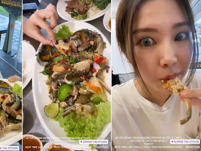Yummy factor: From the looks of it, Ferlyn tried out a Thai-style raw crab dish at Nummun Thai Kitchen and enjoyed every bit of it. The winning combination of lime, chilli padi, onions and herbs must have made the cold dish platter all the more appetising.
