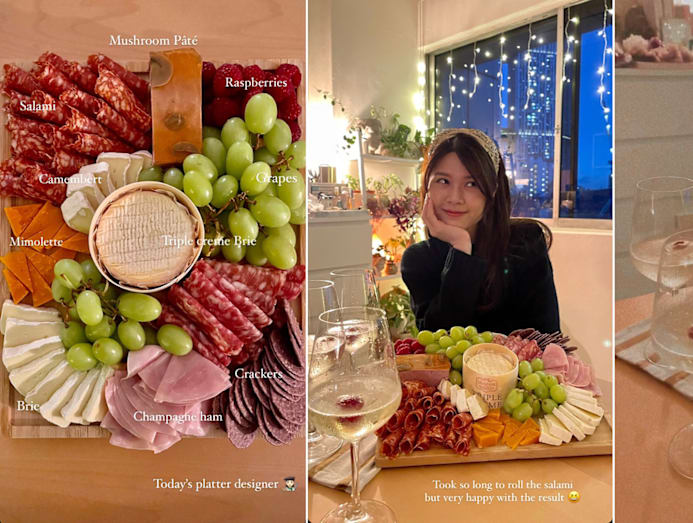 Yummy factor: With Michelle’s eye for detail, it’s probably no surprise that her homemade cold cut platter has to look perfect — even if it means spending more time rolling the salami slices, and slicing the brie and camembert properly. And of course she had to enjoy her cheeses and cold cuts with equally gorgeous drinks.