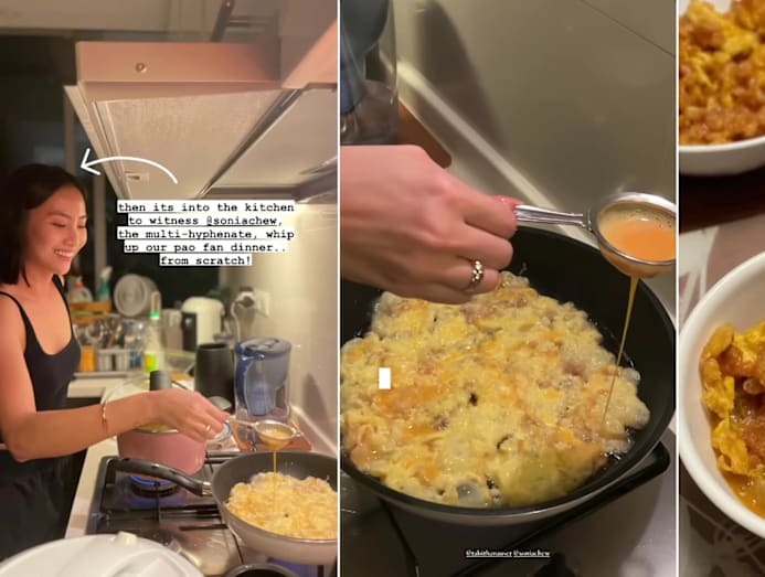 Yummy factor: Sonia is capable of just about anything — including making seafood pao fan with sliced fish and prawns from scratch for pals Rosalyn Lee and Tabitha Nauser. And is it just us, or is her sieve — used to achieve the fluffy fried egg bits — a tad too small?