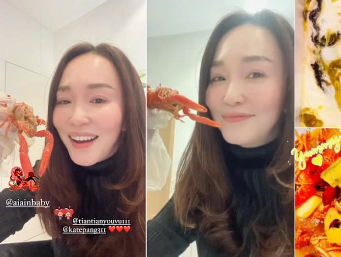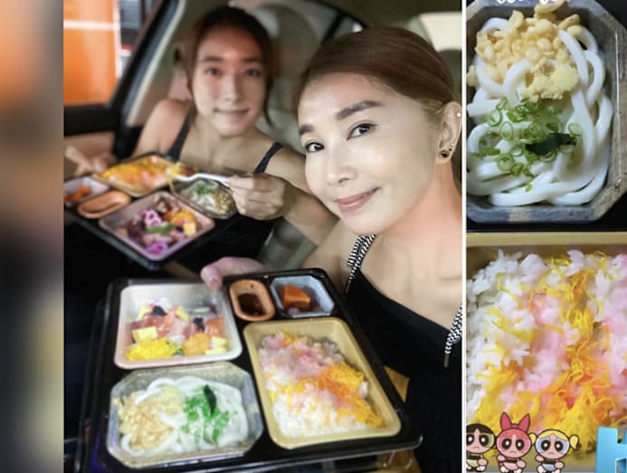 Yummy factor: Eating in one’s car has become the new norm, and Xiuhuan is embracing it — check out the lavish bento sets from Chura Sushi Bar she enjoyed with her daughter Shalynn Tsai in their ride. We spy a colourful assortment of sashimi and uni, as well as udon and rice.